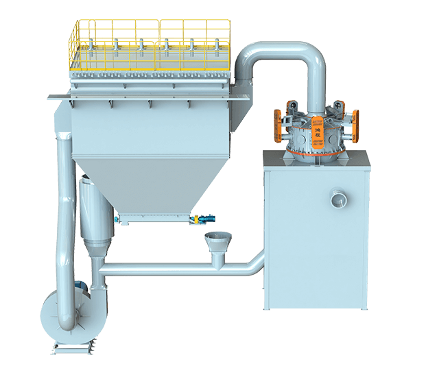 閉路系統(tǒng):物料通過給料機(jī)定量進(jìn)入進(jìn)料管道,與系統(tǒng)進(jìn)風(fēng)混合均勻后,由下端入料口進(jìn)入分級機(jī),符合粒徑要求的細(xì)顆粒隨氣流進(jìn)入旋風(fēng)收集器,經(jīng)收集細(xì)粉后的氣流再次回到分級機(jī),形成閉路,循環(huán)的氣流一部分進(jìn)入余風(fēng)脈沖,經(jīng)除塵后排出,粗顆粒夾帶部分細(xì)顆粒沿筒壁下降至二次風(fēng)處,經(jīng)二次風(fēng)的淘洗作用,使粗細(xì)顆粒分離,細(xì)顆粒上升至分級區(qū)進(jìn)行二次分級,粗顆粒下降至下料口排出。