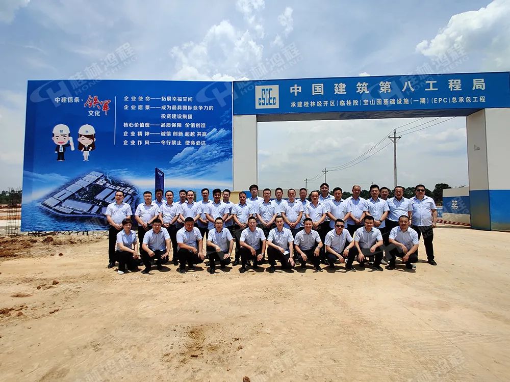 會(huì)后,銷售團(tuán)隊(duì)在桂林鴻程副董事長(zhǎng)容北國(guó)的帶領(lǐng)下,參觀公司位于寶山工業(yè)園的新項(xiàng)目施工現(xiàn)場(chǎng)。三個(gè)月前的奠基儀式依舊清晰在目,而今整片園區(qū)土建工作正在如火如荼的開展,施工現(xiàn)場(chǎng)一派熱鬧。